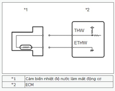 Một nhiệt điện trở có giá trị điện trở thay đổi theo nhiệt độ nước làm mát động cơ, được lắp bên trong cảm biến nhiệt độ nước làm mát động cơ. Cấu tạo của cảm biến và sơ đồ nối của cảm biến với ECM giống với cảm biến nhiệt độ khí nạp.