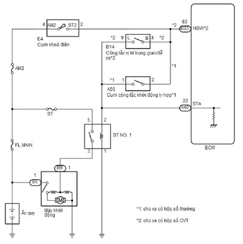 ·Công tắc vị trí trung gian/đỗ xe*1 ·Cụm khoá điện*2 ·Mạch rơle ST NO. 1 ·ECM |
