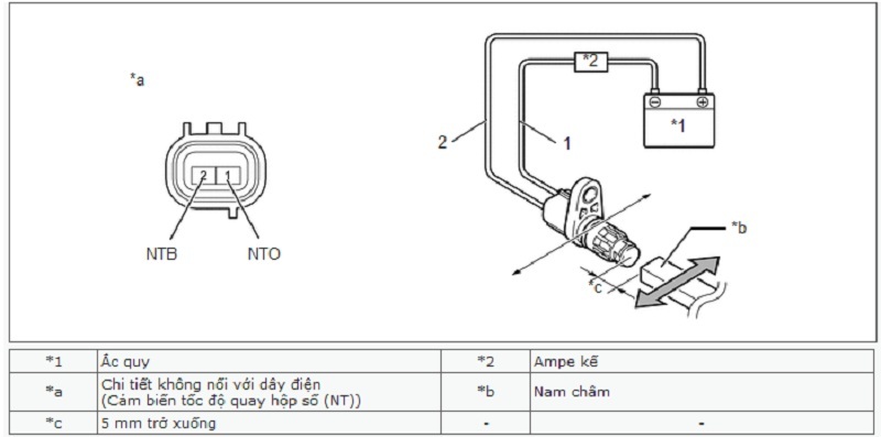 c.Di chuyển một nam châm sang bên trái và bên phải phía trước đầu cảm biến tốc độ hộp số (NT) (khoảng cách từ 5 mm trở xuống) để thay đổi tín hiệu cao/thấp trong khi đo dòng điện phát ra.