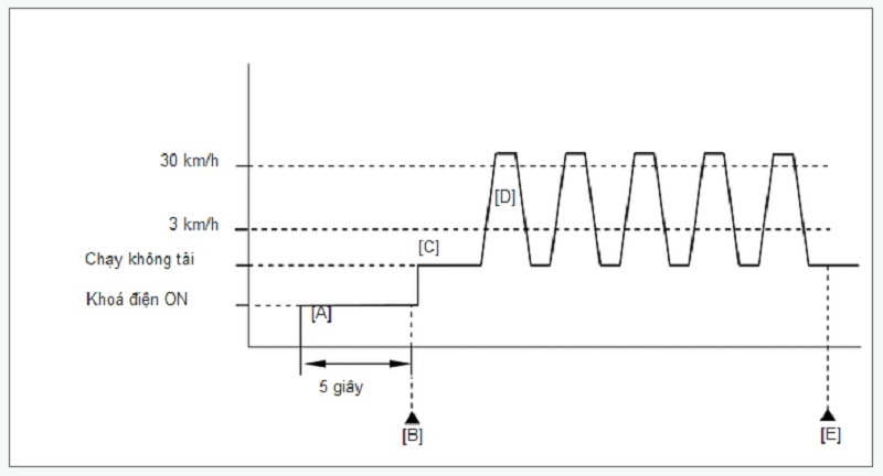 13.Lái xe với tốc độ từ 30 km/h trở lên, đạp phanh và giảm tốc độ xe đến 3 km/h trở xuống [D]. trong 5 lần. Lặp lại bước [D] 5 lần.