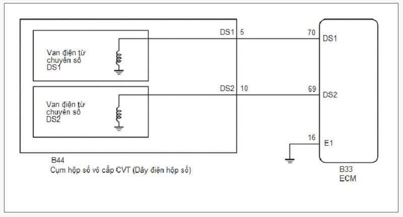 Sử dụng van điện từ chuyển số DS1 (cấp cho puly sơ cấp) và van điện từ chuyển số DS2 (cấp cho puly thứ cấp), ECM sẽ điều khiển áp suất và lưu lượng dầu vào và ra của puly sơ cấp theo tốc độ của xe và vị trí của bàn đạp ga. Nếu mạch van điện từ chuyển số DS1 hoặc DS2 bị hở hay ngắn mạch, ECM sẽ ngừng cấp dòng cho van điện từ chuyển số bị lỗi để đảm bảo chức năng an toàn.