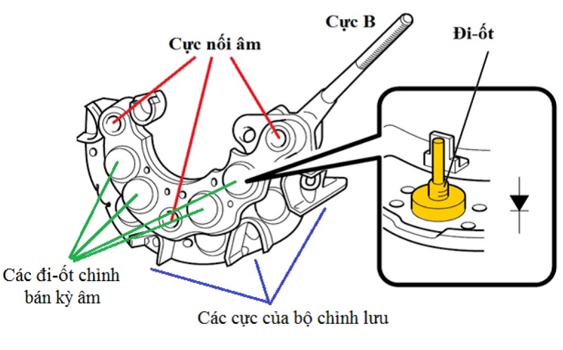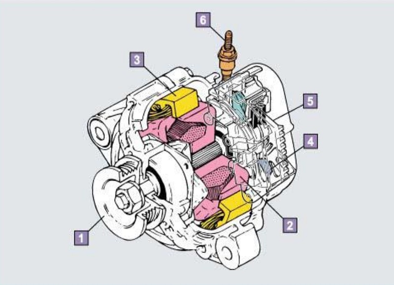 1. Puly; 2. Rotor; 3. Stato; 4. Bộ chỉnh lưu; 5. Bộ ổn áp; 6. Cực B