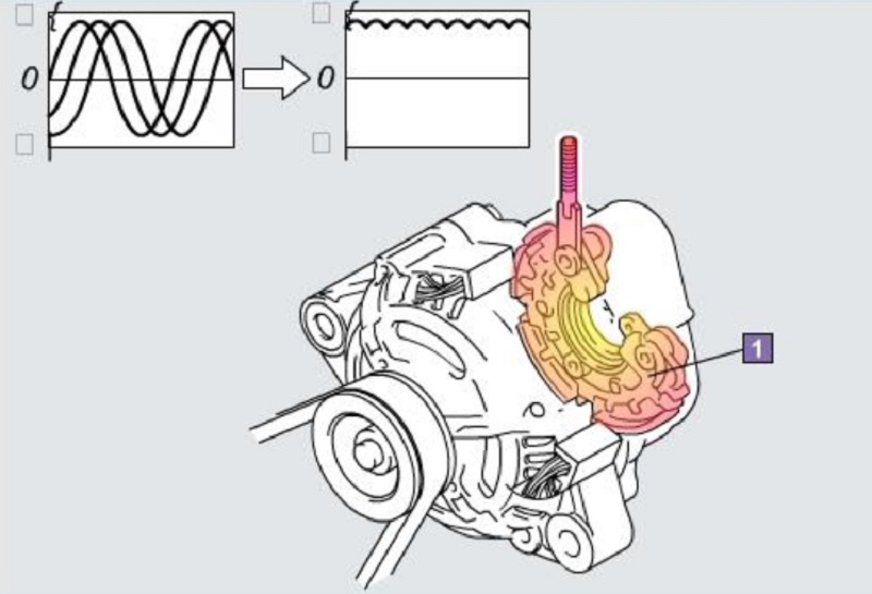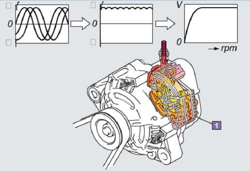 - Chức năng chỉnh lưu: Hệ thống điện của ôtô sử dụng dòng điện một chiều. Do đó một bộ chỉnh lưu (nắn dòng; ký hiệu trong hình là số 1) sẽ thay đổi dòng điện xoay chiều do sta-to phát ra thành dòng điện một chiều.