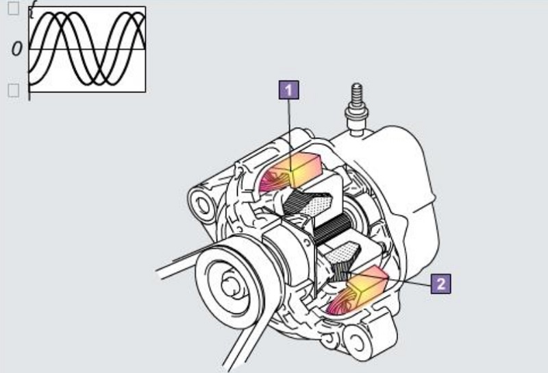 1) quay. Kết quả là cuộn sta-to (ký hiệu trên hình là số 2) phát ra dòng điện xoay chiều.