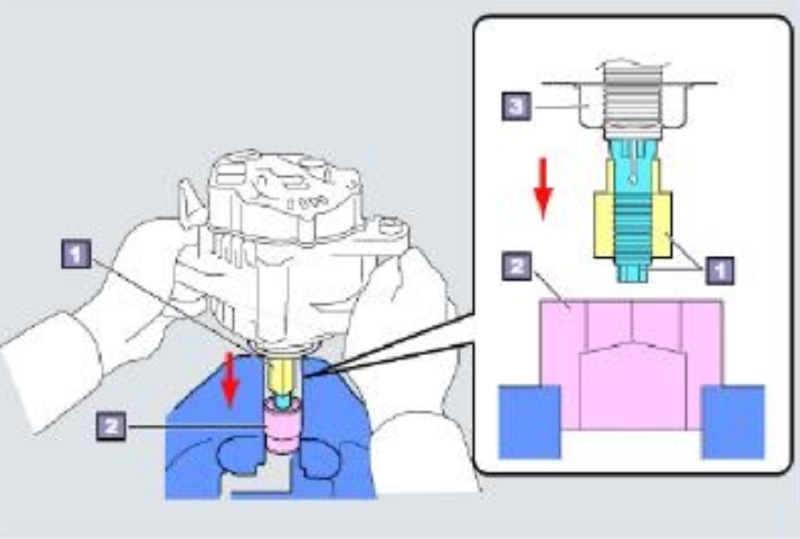 - Bước 1: Lắp SST1-A và SST1-B lên đầu của trục pu-ly. Xiết SST1-A và SST1-B đến mô-men xiết tiêu chuẩn và giữ SST1-A vào trục pu-ly. Mô- men: 39.2 N-m (400kgf-cm)