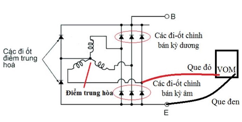 - Sử dụng đồng hồ VOM, nối 1 đầu với cực (-) của bộ chỉnh lưu, đầu kia với từng cực của bộ chỉnh lưu.