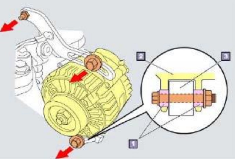 - GỢI Ý: Do phần lắp máy phát có bạc để định vị, nó ăn khớp rất chặt. Vì lí do đó, hãy lắc máy phát lên và xuống để tháo ra.