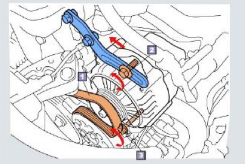 - Đối với loại không có puly căng đai (đối với động cơ 1NZ-FE): (không có bu-lông điều chỉnh), lực căng của đai dẫn động được điều chỉnh bằng cách dịch chuyển những bộ phận phụ trợ bằng một cần. Do đó cách tháo cũng có khác đôi chút: