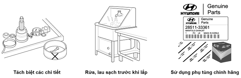 Khi tháo, mỗi chi tiết được tháo ra cần được kiểm tra kỹ lưỡng xem có dấu hiệu bị hư hại, biến dạng, chảy dầu hoặc các hư hại khác trước khi tháo đến chi tiết tiếp theo. Tất cả các chi tiết được tháo ra phải được sắp xếp gọn gàng, đúng trình tự. Tất cả các chi tiết trước khi được lắp ráp lại cần được rửa sạch bằng dung dịch rửa thích hợp, lau khô, thổi khí nén cho sạch bụi tại các khe kẽ. Khi thay thế, cần phải sử dụng phụ tùng chính hãng và đúng chủng loại phụ tùng.