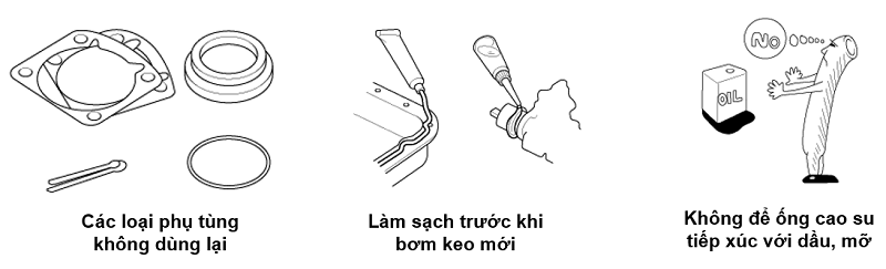 Khi tháo dời bản thân cụm chi tiết, các loại chi tiết sau đây cần được thay mới đó là các loại phớt dầu, gioăng, vòng O, các loại đệm khóa, chốt, chốt chẻ, đai ốc bằng nhựa … Tùy thuộc vào từng vị trí cần phải dùng keo bôi vào các bề mặt trước khi lắp ráp. Đối với các chi tiết chuyển động cần bôi một chút dầu bôi trơn (đúng chủng loại) vào bề mặt ma sát trước khi lắp ráp. Tránh để dầu bôi trơn, dầu phanh, xăng tiếp xúc với các chi tiết bằng cao su.