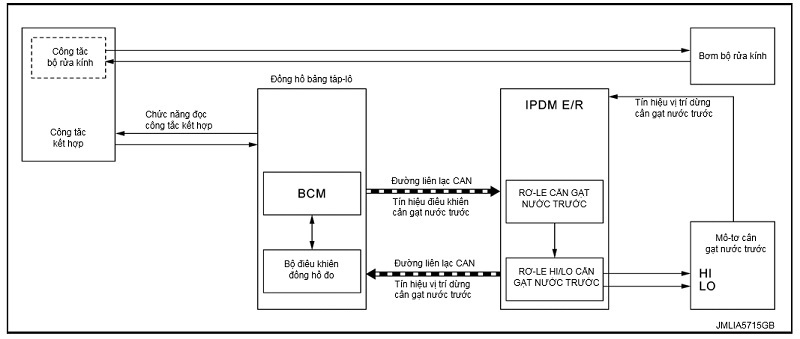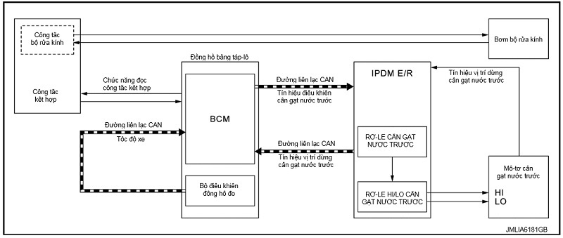 • BCM truyền tín hiệu điều khiển cần gạt nước trước (HI) tới IPDM E/R thông qua liên lạc CAN theo điều kiện vận hành HI cần gạt nước trước.
