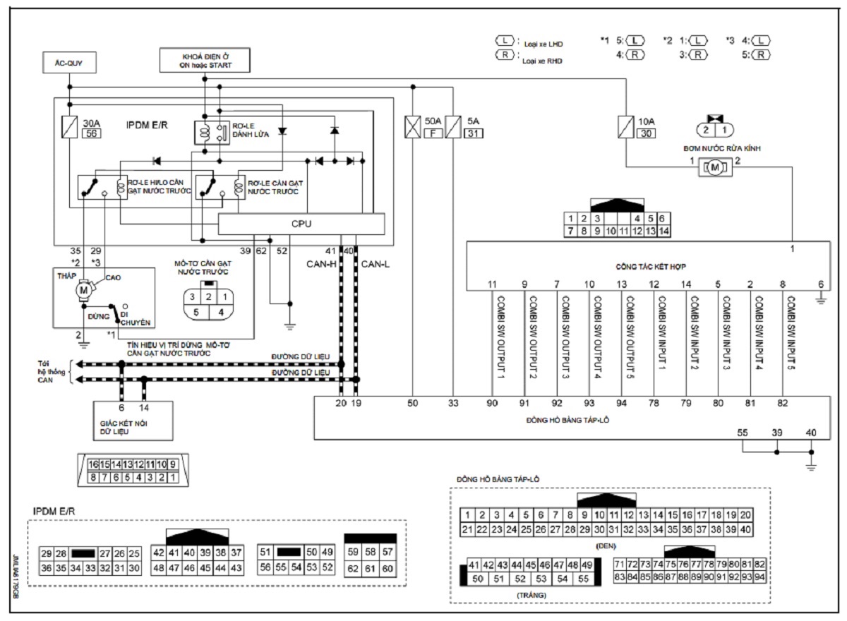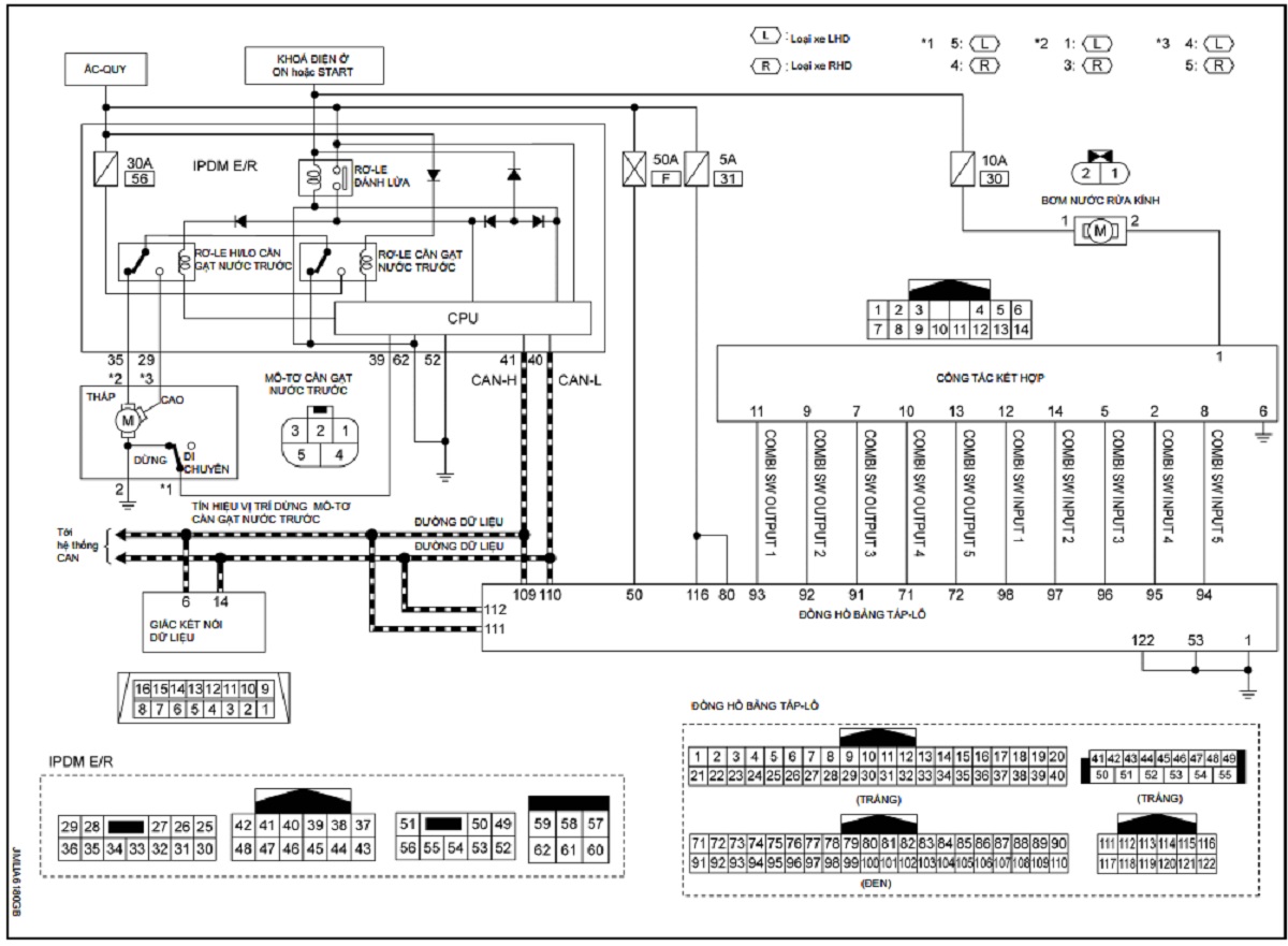 • BCM truyền tín hiệu điều khiển cần gạt nước trước (LO) tới IPDM E/R thông qua liên lạc CAN theo điều kiện vận hành LO cần gạt nước trước.