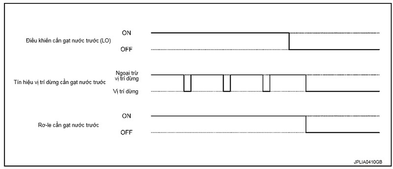 Khi dừng tín hiệu điều khiển cần gạt nước trước, IPDM E/R BẬT cho đến khi mô-tơ cần gạt nước trước quay về vị trí dừng.
