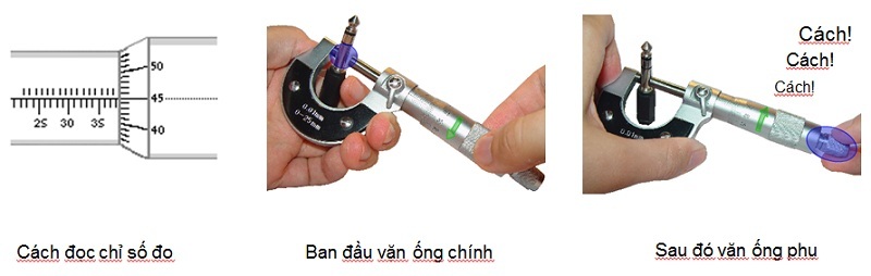 Ngày nay, một số ca líp còn thêm chỉ số phụ thứ 2 có vạch chia 0.002mm giúp đo có độ chính xác cao hơn. Khi đo ta vặn ống chính cho trục vừa chạm vào chi tiết cần đo sau đó vặn ống phụ cho đến khi nghe thấy tiếng “cách” nhỏ thì dừng lại.