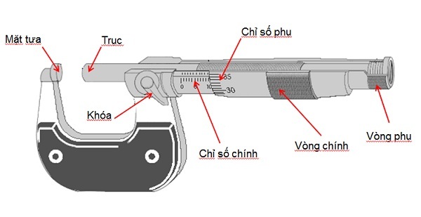 Trục được tiện ren chính xác có bước ren là 0.5mm, do vậy, khi trục quay được 1 vòng thì nó tịnh tiến được 0.5mm. Chỉ số chính được chia thành từng 1mm với một gạch phụ chia 0.5 mm bên trên. Chỉ số phụ được chia thành 50 phần bằng nhau với mỗi phần tương đương 0.01mm. Như vậy để đọc số được đo ta chỉ cần đọc chỉ số chính (có để ý đến phền chia 0.5mm) và cộng với chỉ số phụ.