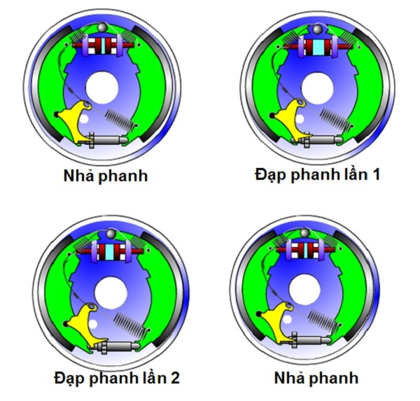 Khi má phanh bị mòn, guốc phanh phải đi xa hơn để tiếp xúc với trống phanh. Khi khoảng cách giữa má phanh đến trống phanh tiến đến một giới hạn nhất định thì cơ cấu tự điều chỉnh sẽ đẩy guốc phanh tới gần trống phanh hơn.