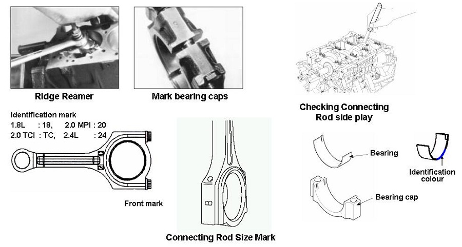 Nếu các thanh truyền mới (hoặc một trục khuỷu mới) được lắp, hãy đảm bảo rằng một số chi tiết phụ vẫn được giữ lại. Kiểm tra các thanh truyền và nắp để tìm các dấu hiệu nhận biết, chẳng hạn như dịch chuyển, dấu phía trước (ví dụ: 2 dấu chấm phải chỉ về hướng phía trước của động cơ) hoặc Dấu kích thước thanh truyền. Vui lòng tham khảo Hướng dẫn sửa chữa để biết thêm thông tin chi tiết.