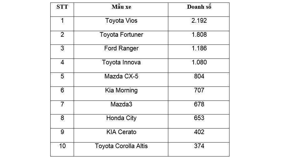 Danh sách 10 mẫu xe bán chạy nhất tháng 8/2018 theo thống kê của Hiệp hội các nhà sản xuất ô tô Việt Nam (VAMA) không có gì thay đổi về thành phần so với tháng 7, nhưng có sự xáo trộn lớn về vị trí giữa các mẫu xe. Vị trí số 1 vẫn thuộc về Toyota Vios; trong khi Ford Ranger để mất ngôi "á quân" vào tay Toyota Fortuner.