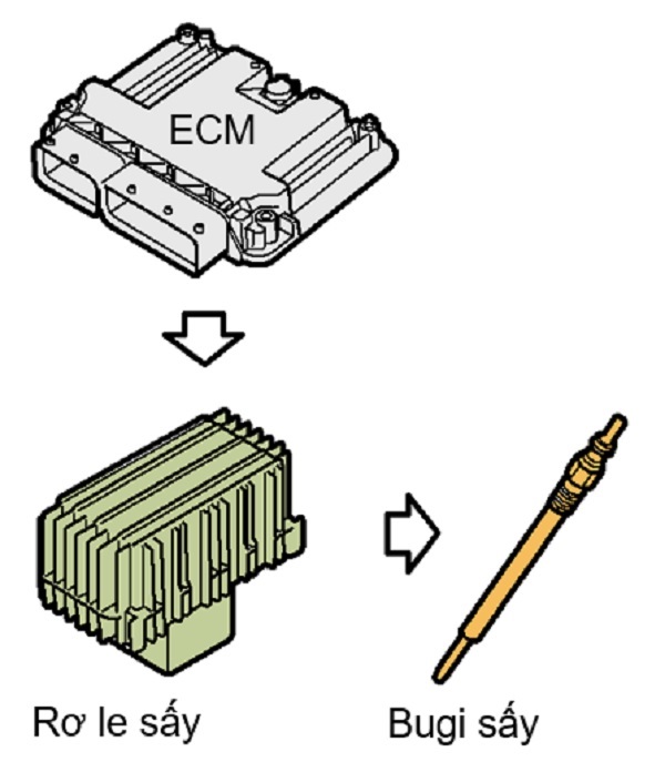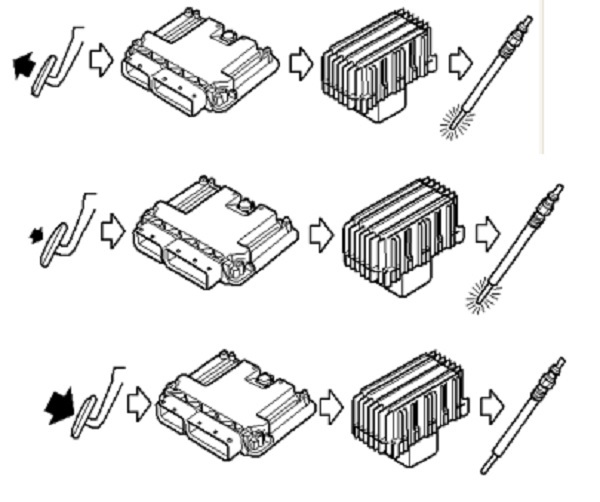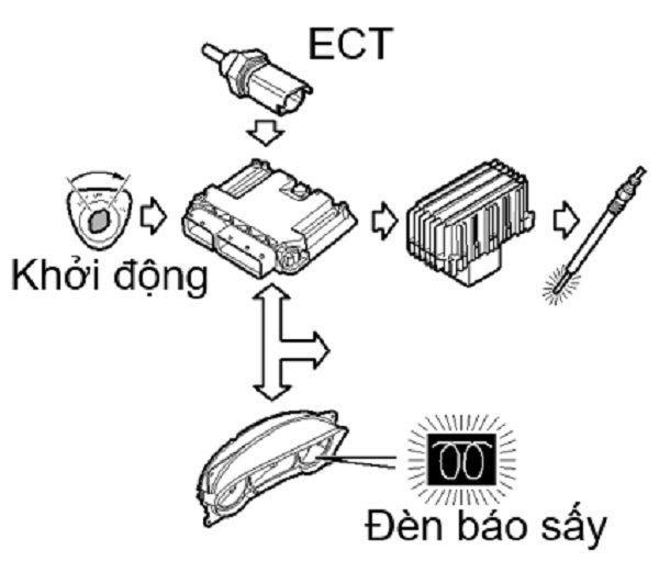 Chế độ sấy trước khi khởi động: Ngay khi chìa khóa khởi động bật ON, hệ thống bắt đầu sấy trước khi khởi động, đèn báo sấy trên bảng táp lô bật sáng. Thời gian sấy phụ thuộc vào nhiệt độ nước làm mát.