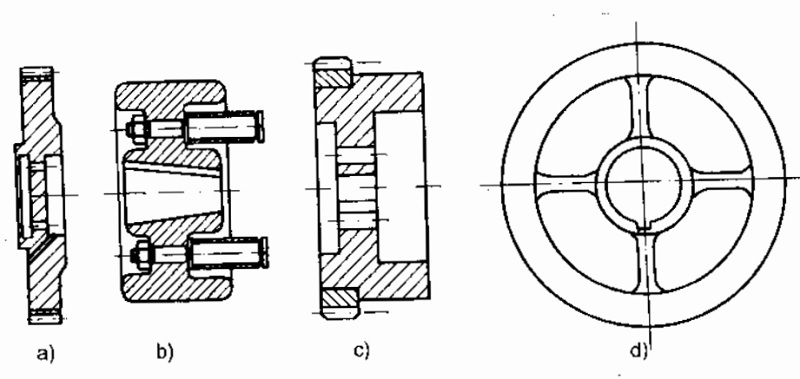 - Bánh đà dạng đĩa (hình 2-33a) là bánh đà mỏng có mômen quán tính nhỏ nến chỉ dùng cho động có tốc độ cao và rất hay gập ð động có Ô tô, máy kéo. Bề mại bánh đà được gia công phẳng, nhẫn để lắp đĩa ma sát và đĩa ép ly hợp. Ngoài ra, lrên bánh đà thường được lắp ép vành răng khỏi động.