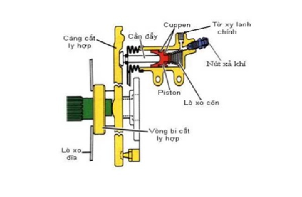 - Cấu tạo của tổng côn dướiđược minh họa ở hình bên. Dầu thủy lực từ xylanh tổng làm cho pittông của xy lanh đẩy thanh đẩy làm thanh đẩy đẩy càng cắt ly hợp.