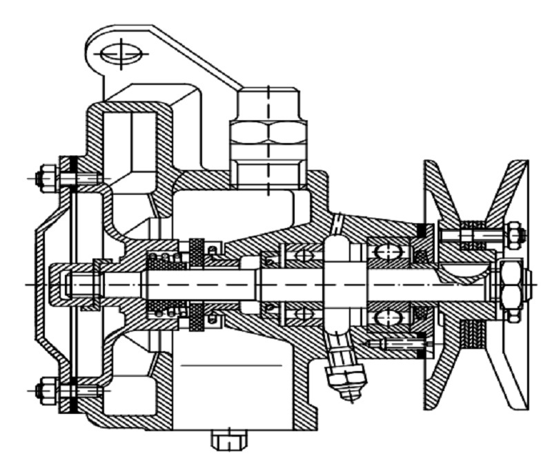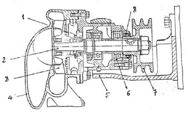 Trên hình 7.11. giới thiệu kết cấu một loại bơm nước ly tâm dùng trên ô tô lắp ở mặt đầu của thân máy và dẫn động quay bơm nước bằng đai truyền nhở puli 7. Nắp bơm 4 và thân bơm 5 được chế tạo bằng gang, cách bơm 3 thường được chế tạo bằng đồng hoặc chất dẻo. Đế giảm kích thước bơm tỷ số truyền giữa trục bơm nước 2 và trục khuýu thường chọn gần bằng I(đối với động cơ cao tốc) và 1,6 (đối với động cơ tốc độ thấp). Nước ổ chỗ vào cách có áp suất: 0,02 -0,04 Mpa và tốc độ 1,0m/⁄s. Cột áp do bơm tạo ra khoảng 0,05 - 0,15 Mpa và tốc độ nước trên đường ống dẫn vào bơm không vượt quá 2,5 -3m/s. Công suất tiêu hao để dẫn động bơm chiếm khoảng 0,5-1,0% công suất có ích của động cơ tức là (0,005 -0,01)N. Trục bơm được đặt trên hai ố bi cầu 6, để bao kín dầu mỡ bôi trơn ố bi đùng các phót 8 và bao kín bằng phới 1.