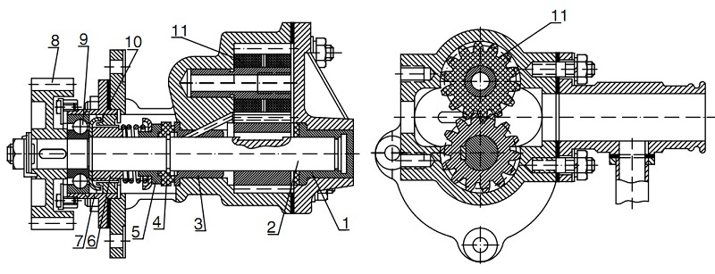 chắn dâu; §. Bánh răng;9. Ổ bi cầu; 10. Phớt bao kín; 11. Bánh răng bị động.