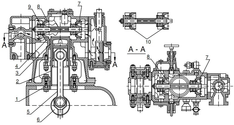 piston; 7,8. Van nước; 9. Lỏ xo van nước; 10. Nắp van.
