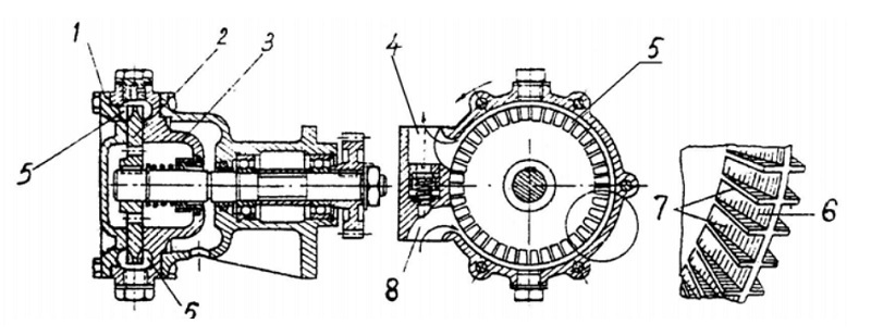 ta phay các rãnh hướng kính 6. Vỏ và nắp có làm rãnh xoáy 5 thông với cửa hút 8 và