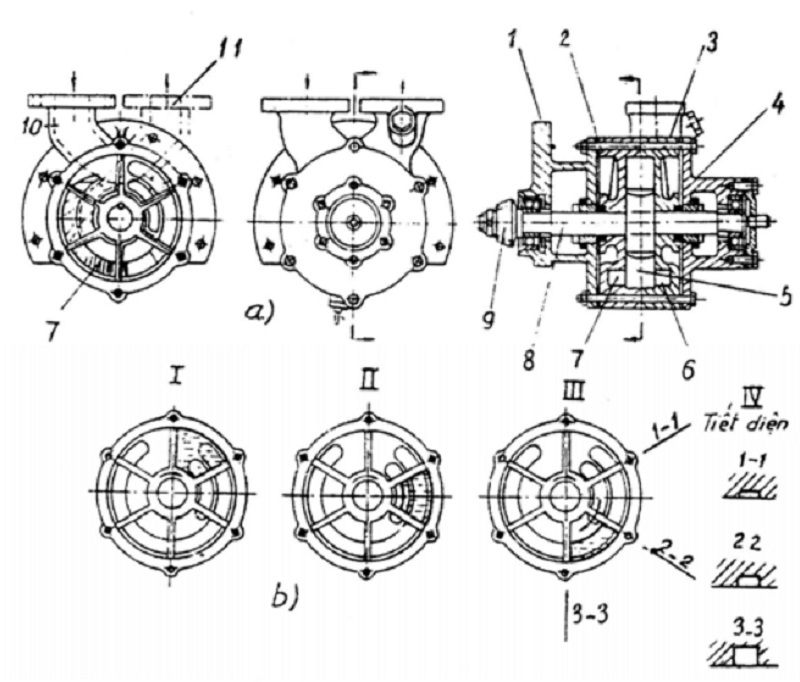 Kết cấu của bơm gồm: nửa trước 3 và nửa sau 2. Các nửa vỏ bơm lắp với hai
