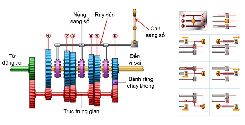 Hình vẽ trên mô tả sơ đồ sang số. Một vòng răng chỉ có thể ăn khớp hoặc nhả khớp tối đa với hai bánh răng tùy thuộc vào từng vị trí được chọn. Để về số mo, tất cả các vòng răng phải ở vị trí trung gian. Để sang số phải di chuyển cần sang số, chuyển động này được truyền đến nạng sang số theo từng ray riêng. Nạng sang số sẽ đẩy vòng răng ăn khớp vào từng bánh răng tùy theo số được chọn.