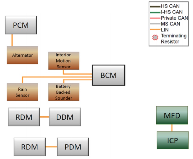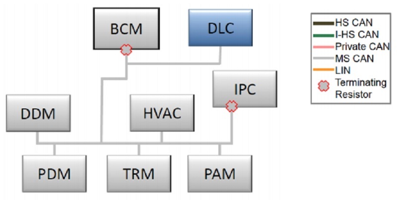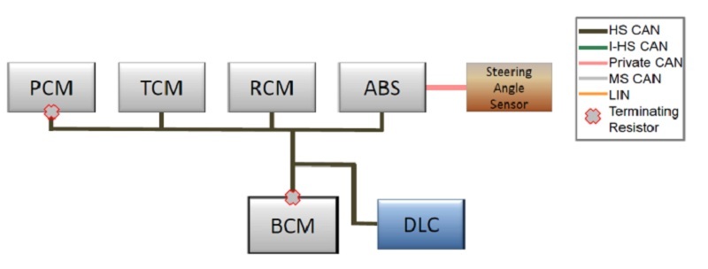 Hai điện trở giới hạn của đường truyền HS CAN được đặt trong hộp BCM (body control module) và hộp điều khiển động cơ (PCM).Tốc độ truyền của đường truyền HS CAN là 500 kBit/s.