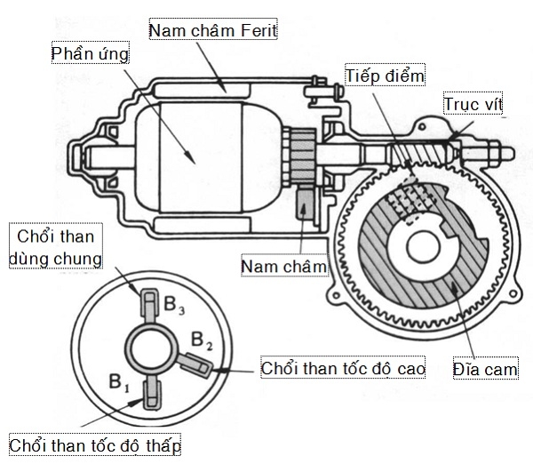 Khi dòng điện từ chổi tốc độ thấp qua cuộn ứng một sức điện động đảo chiều lớn được sinh ra, làm cho môtơ quay chậm.