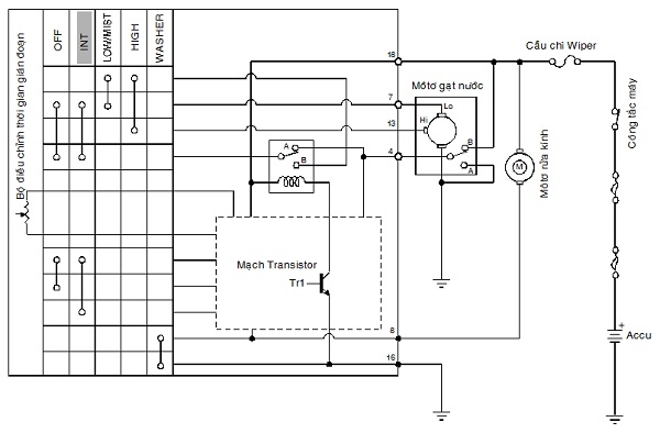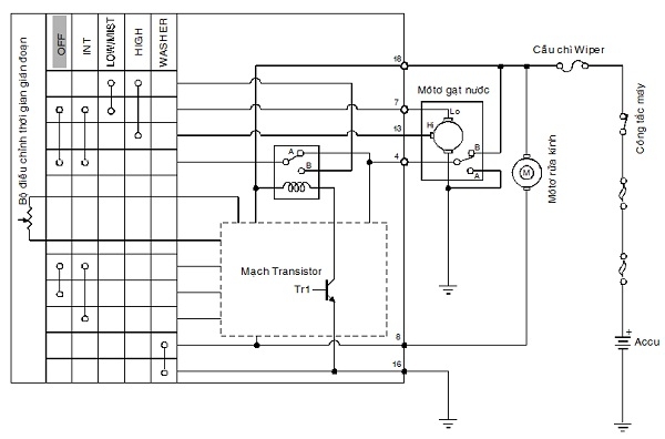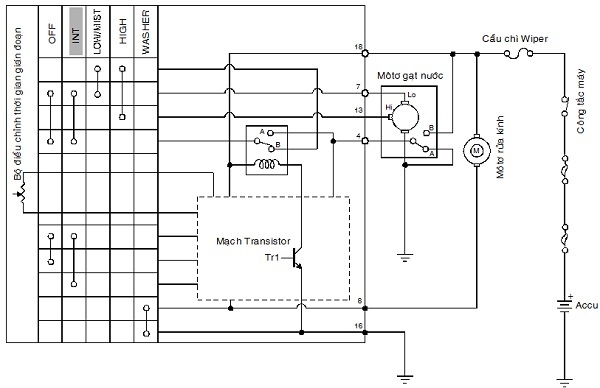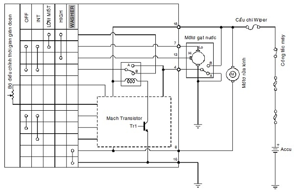 Accu + tiếp điểm B công tắc cam cực 4 tiếp điểm rơle các tiếp điểm OFF công tắc gạt nước cực 7 môtơ gạt nước (LOW) mass.