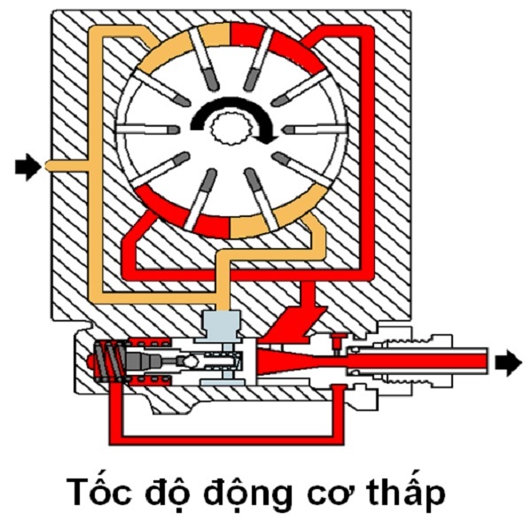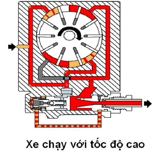Áp suất và lưu lượng dòng dầu thủy lực sinh ra cao, sự chênh lệch về áp suất giữa hai bên lỗ tiết lưu lớn, thân van được đẩy về bên trái. Một phần dầu thủy lực sẽ được quy lại đường hút của bơm do đó giảm được áp suất và lưu lượng của bơm.