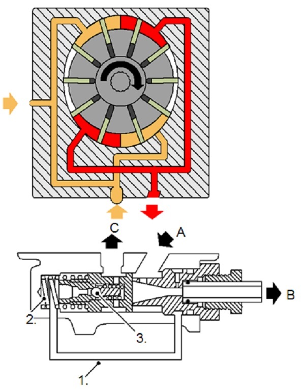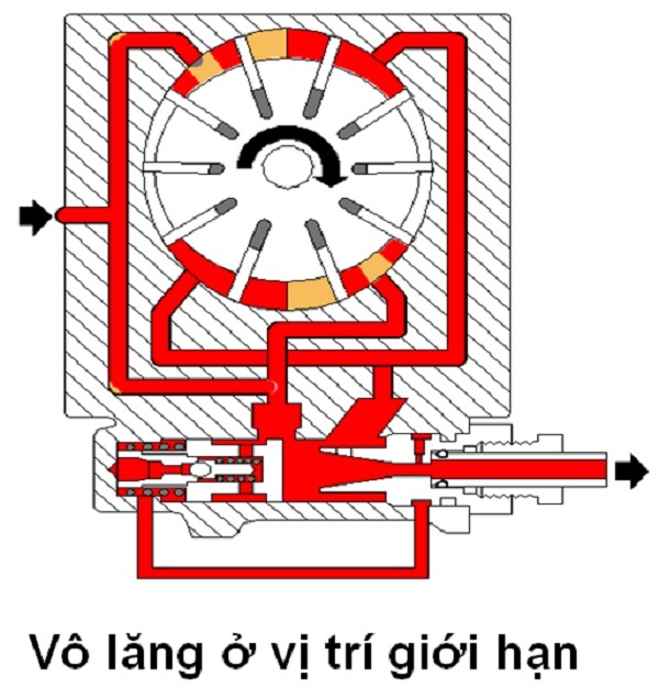 Khi vô lăng được đưa đến vị trí giới hạn bên phải hoặc bên trái, áp suất thủy tăng lên cao và mở van tràn, phần lớn dầu thủy lực sẽ hồi ngay lai cửa hút của bơm.