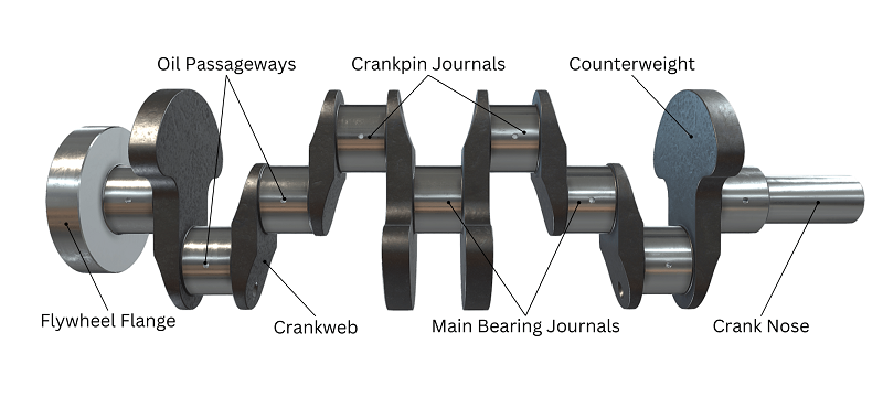 Đầu trục khuỷu, khuỷu trục (chốt, má,cổ trục khuỷu) và đuôi trục khuỷu.