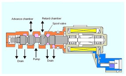 - Van điều khiển dầu phối khí trục cam là một van điện từ được điều khiển bởi bộ điều khiển vvti, có chức năng điều chỉnh lượng dầu chảy vào và ra khỏi một ổ trượt trên trục cam nạp. Ổ trượt này có một rãnh xoắn ốc, khi dầu chảy vào, nó sẽ tạo ra một lực xoắn để xoay trục cam nạp theo chiều kim đồng hồ hoặc ngược lại, tùy thuộc vào hướng dòng dầu.