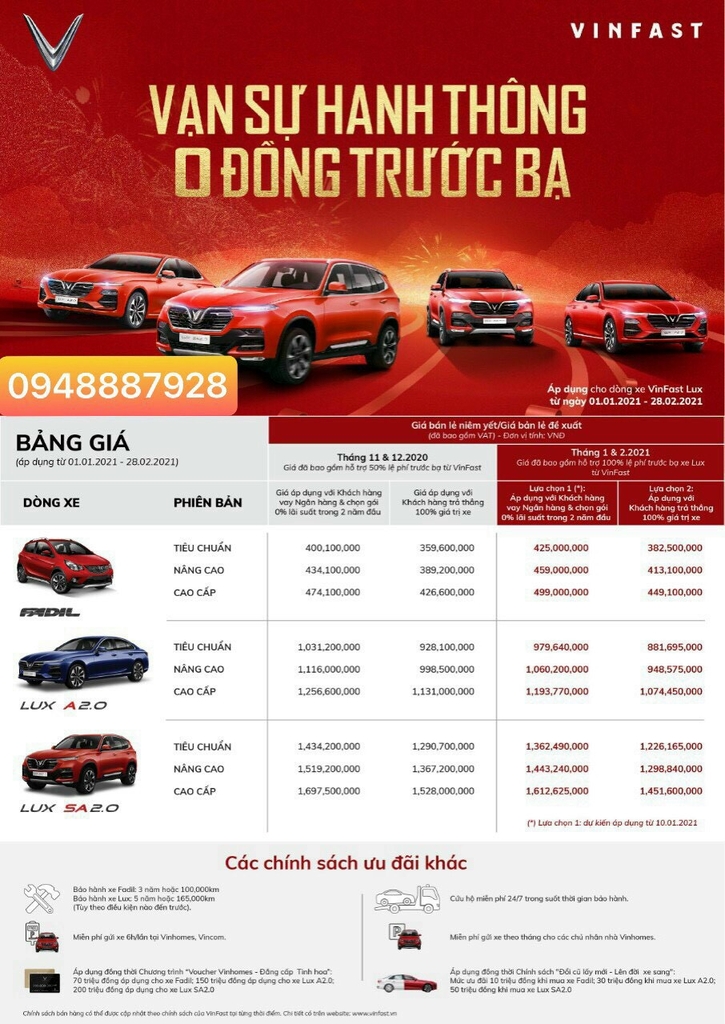 (***) Tham khảo thông tin bán lẻ xe tháng 01 và 02/2021 công bố trên bảng giá. Tìm hiểu thêm chính sách chi tiết tại: https://otovinfastvietnam.vn/